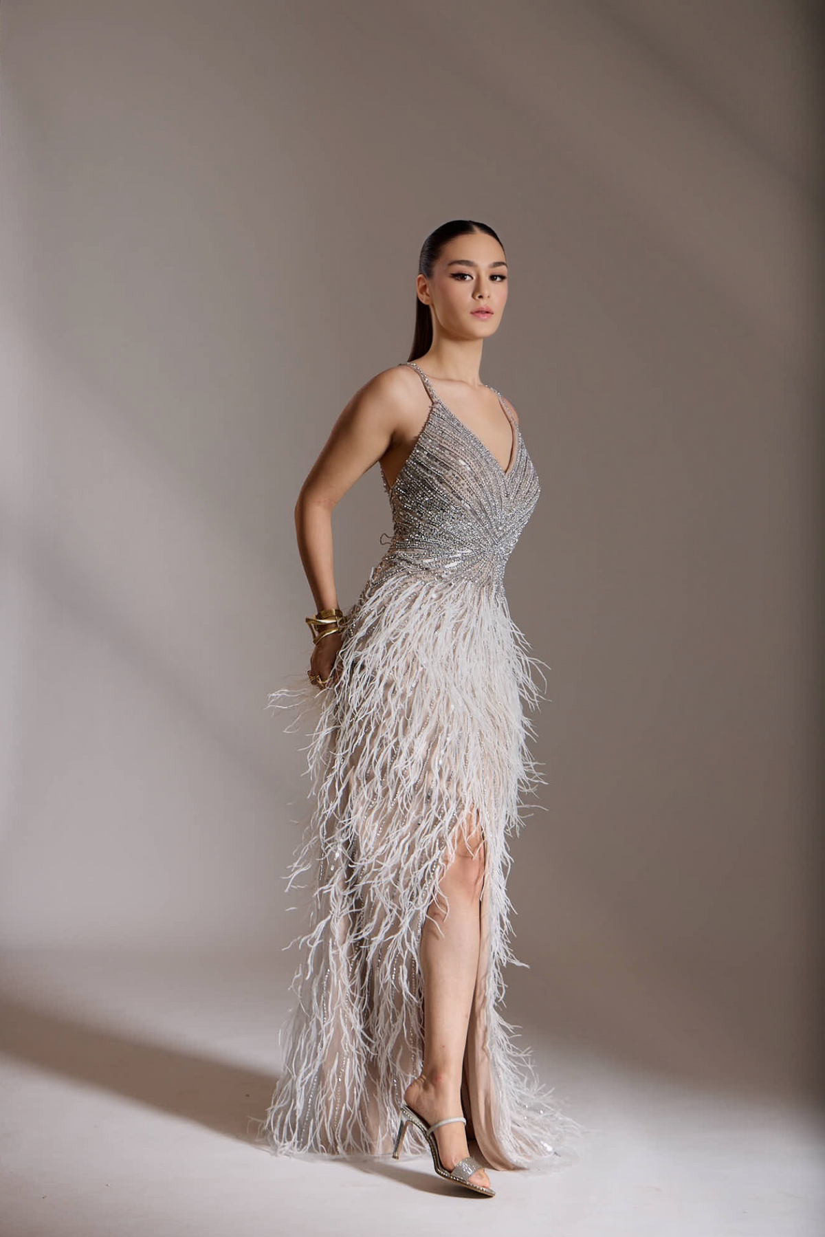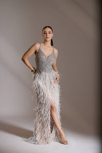 Adorned with cascading ostrich feathers creating movement like a soft breeze,  Fabric ostrich feather hand work, stone, detailing On Satin, Colour mix with 3 colour handwork silver Off white ostrich feathers With some golden touch