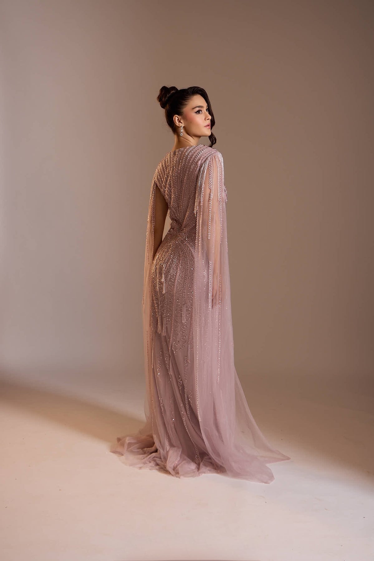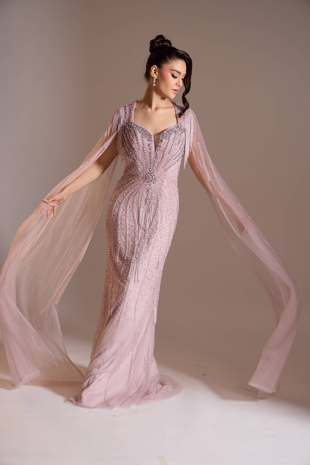 An enchanting piece that embodies elegance and timeless charm. Adorned with delicate silver zari and crystal embroidery, the design features intricate floral vines that shimmer with every movement. The interplay of metallic threads and sparkling crystals creates a luminous, romantic aura, making it a perfect choice for evening soirées, weddings, or any occasion where love and grace take center stage.