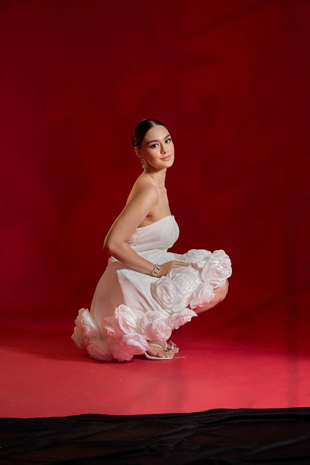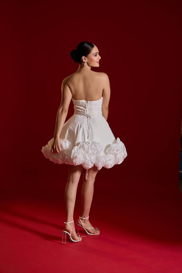 • Skirt decorated with 3D appliqué roses crafted from organza/satin fabric.
